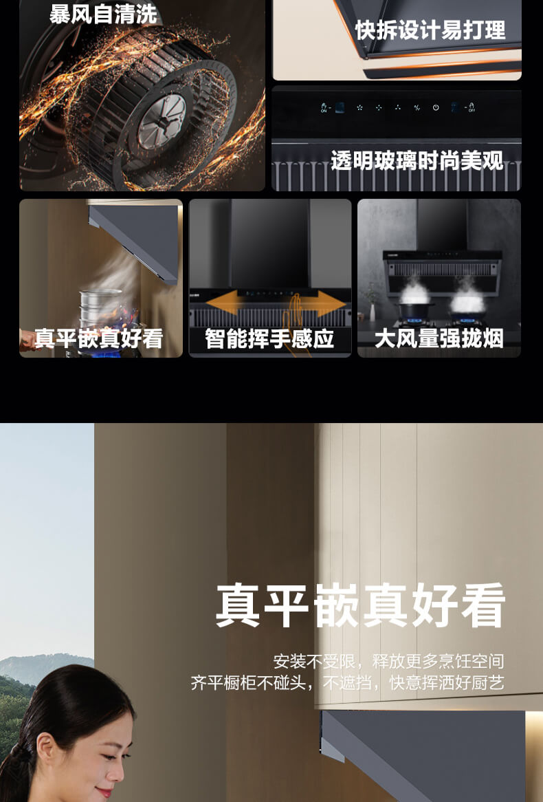 頂側一體真平嵌,20方超大風量,450Pa大風壓,快拆設計易打理易清潔,智能熱熔洗,揮手智控
